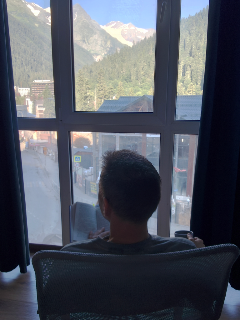 Как прекрасно начинать день с чашкой кофе, книгой и видом на горы!)