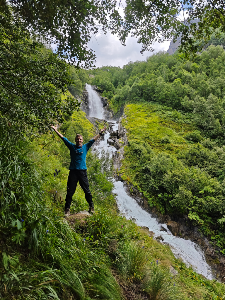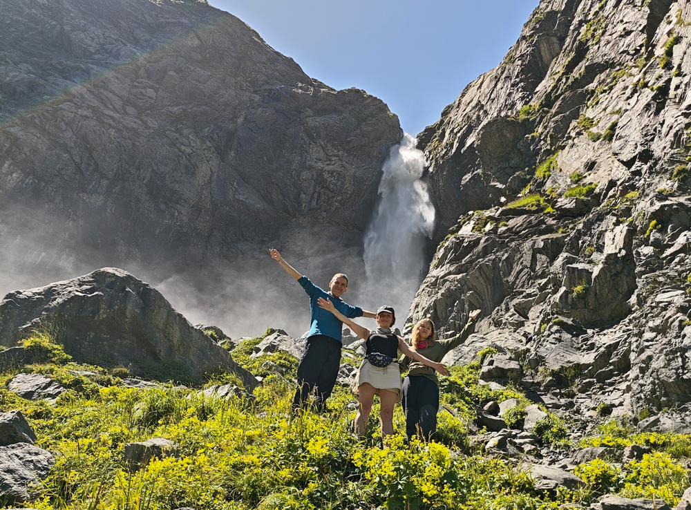 Чучхурские водопады. Вторая попытка постоять под струями снова не удалась — из-за мощного потока воздуха и водяных брызг подойти близко невозможно. Зато если подняться выше, открывается потрясающий вид на долину!