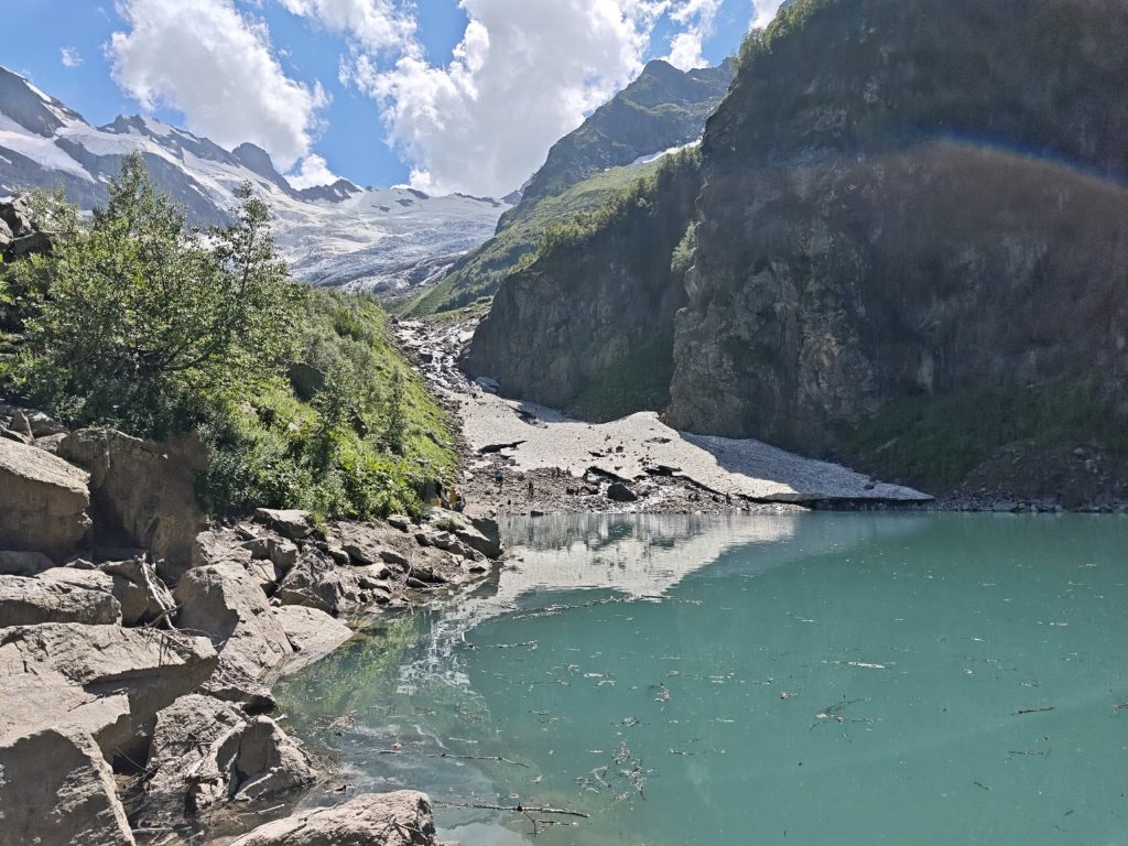 Снежник с ледника Алибек спускается прямо в озеро, что дарит незабываемые ощущения во время купания.