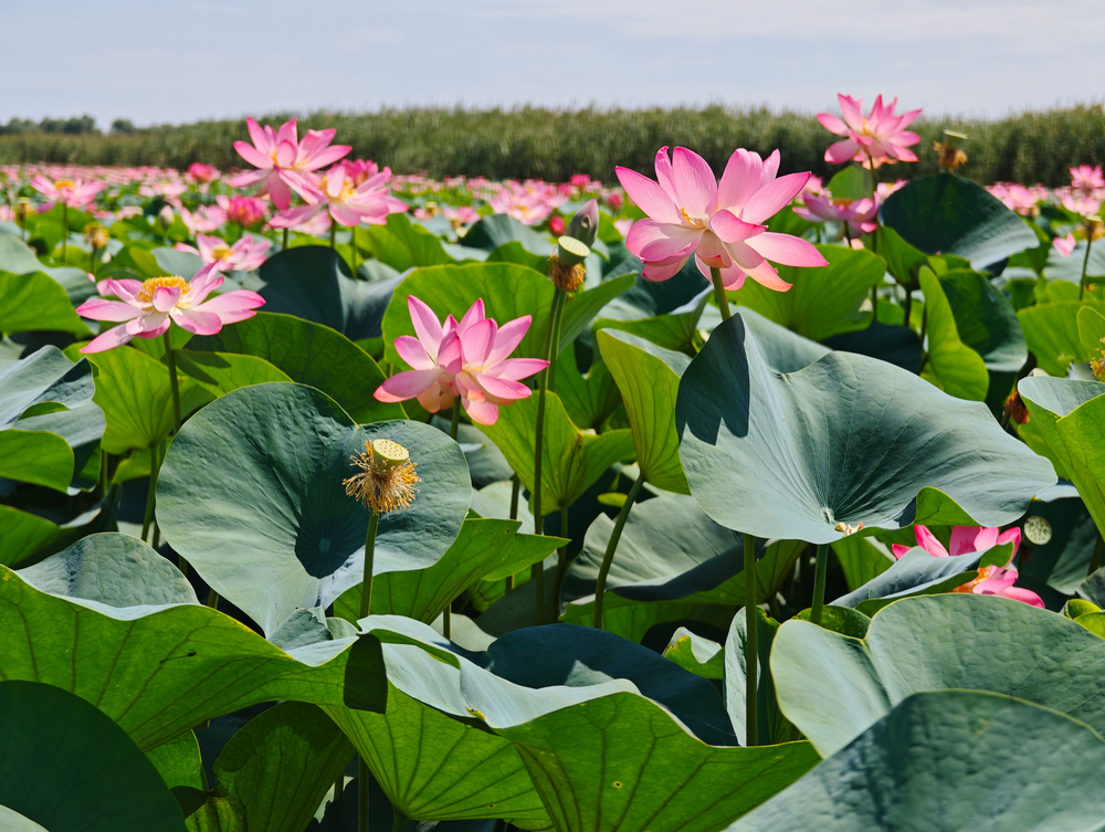 Лотосовые поля в дельте Волги! Глядя на них, так и хочется сесть в позу лотоса! Хотя, если честно, смотрю я на цветок и не совсем понимаю, почему эта поза так называется — сходство неочевидно…)