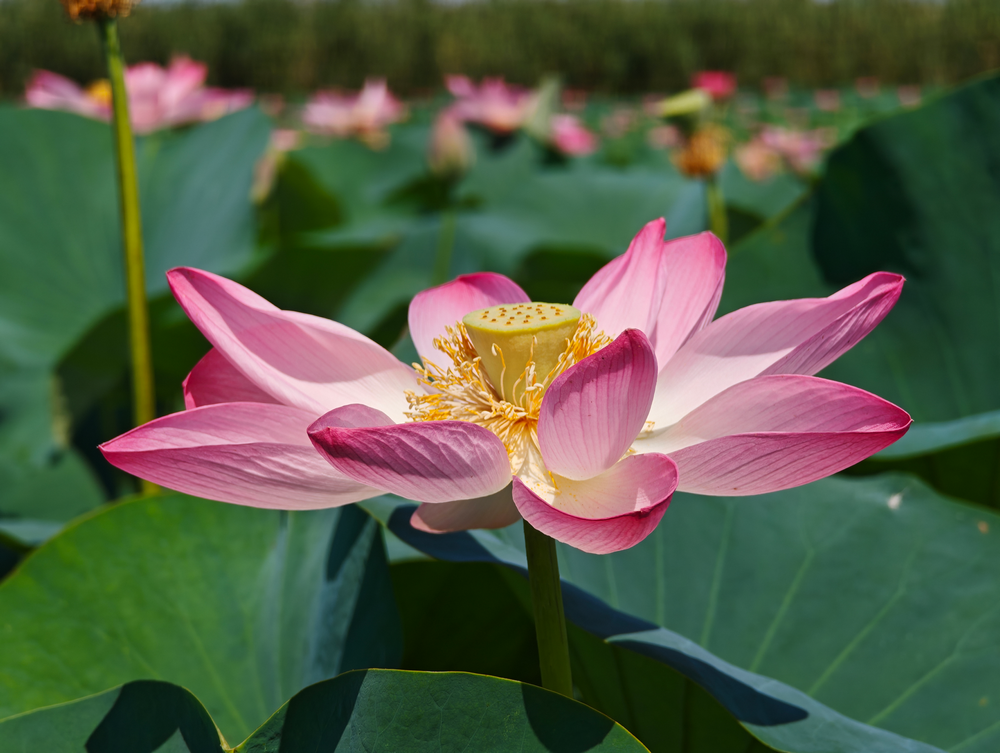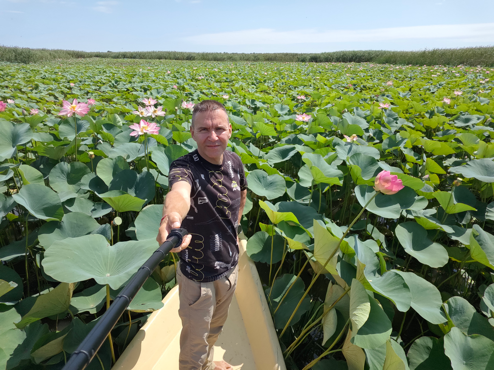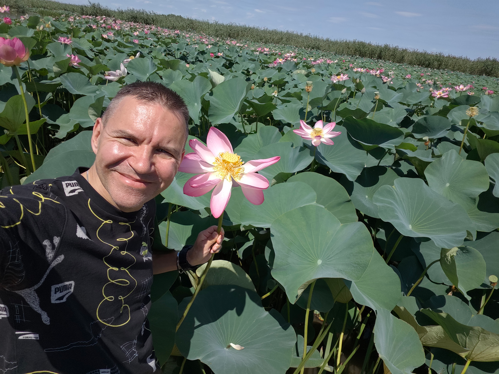 Лотосовые поля в дельте Волги! Глядя на них, так и хочется сесть в позу лотоса! Хотя, если честно, смотрю я на цветок и не совсем понимаю, почему эта поза так называется — сходство неочевидно…)